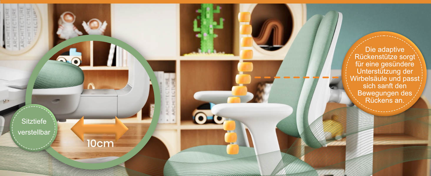 - Adjustable Seat Depth. Seat can be moved 10 cm forward or backward, auto-follow backrest for optimal support at every learning stage, comfortable for every body shape.