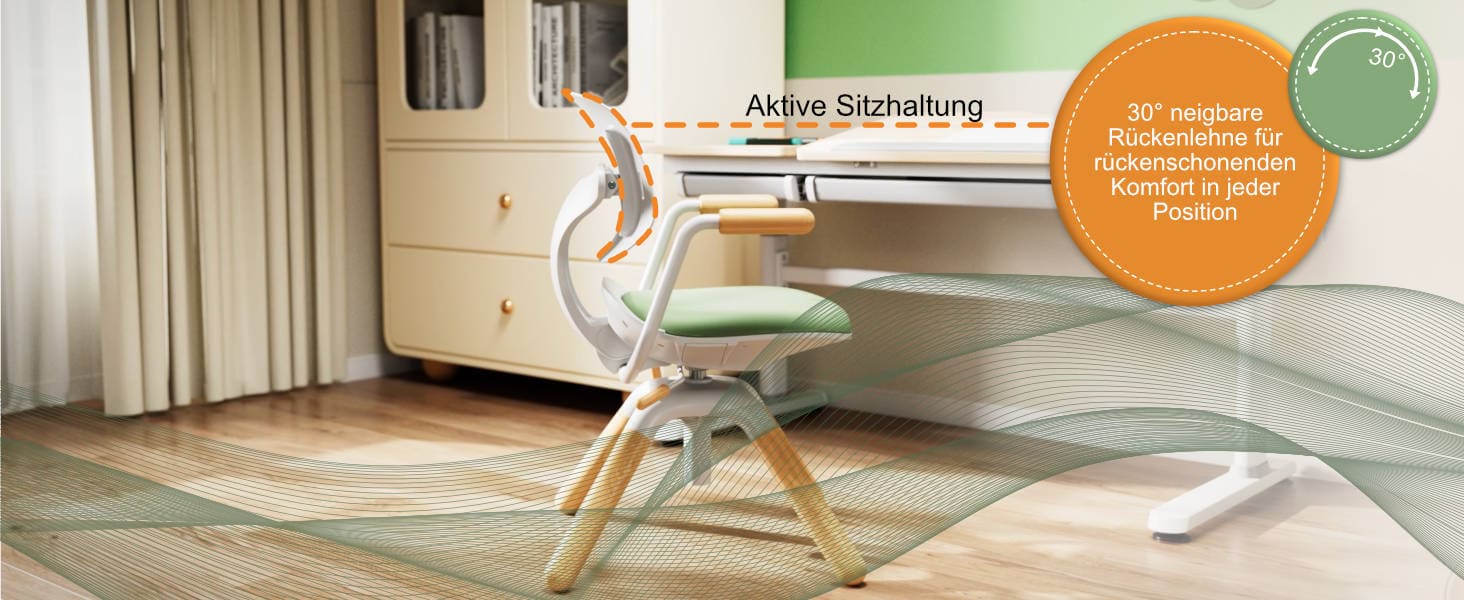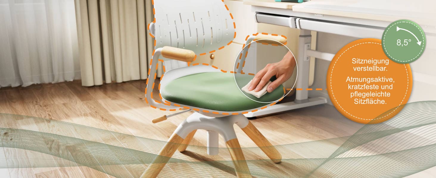 Ergonomic and grows with your child: adjustable seat height, seat depth and backrest, 360° swivel function, tiltable backrest, soft, breathable seat cushion, supports up to 120 kg.