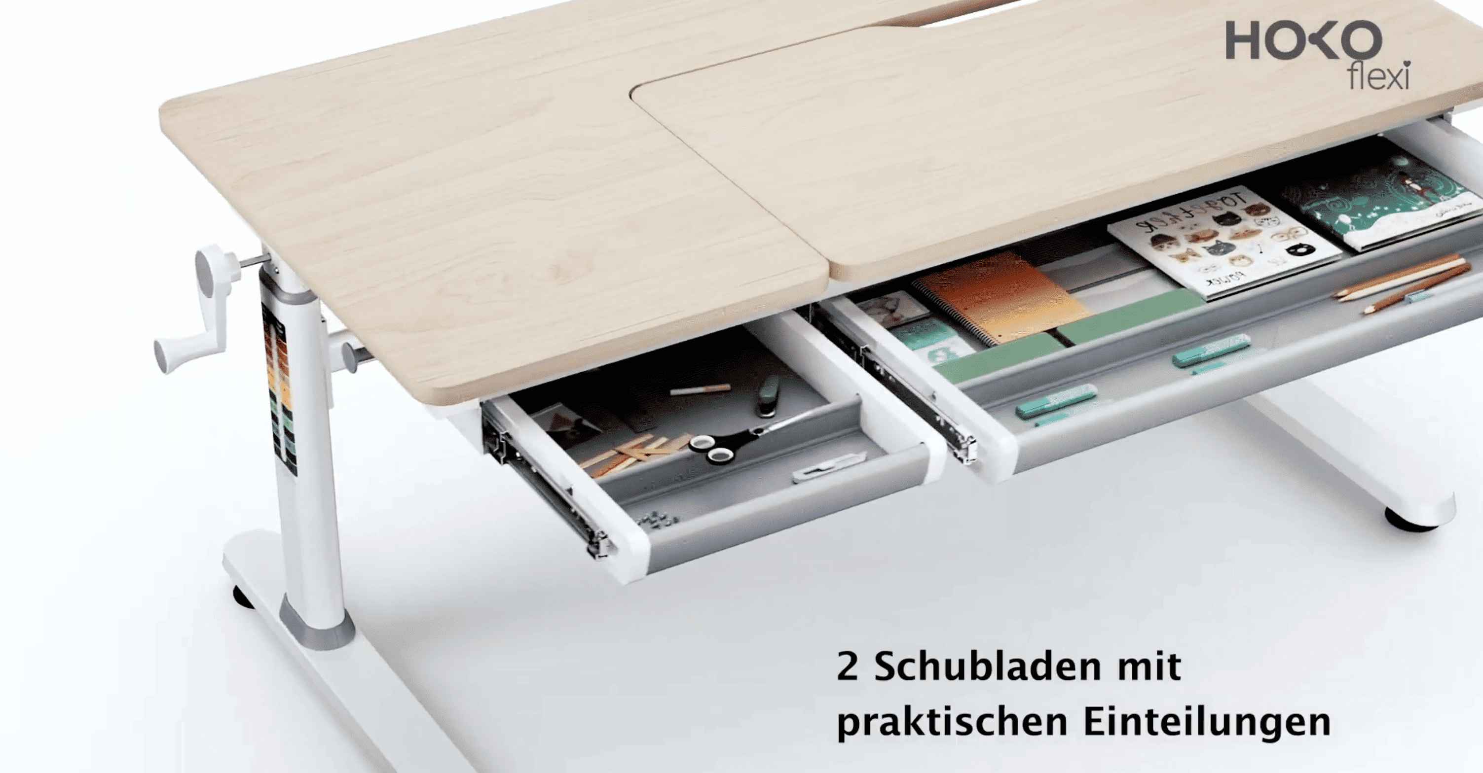 Table with anti-reflective surface, overall size 100x60 cm, adjustable tabletop 100x40 cm (0–50°), height adjustment 54–76 cm with hand crank. Includes drawer, rounded edges, bag hook, and leveling feet. Load capacity up to 100 kg.